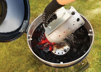 Fyll på med önskad mängd kol/briketter i och använda Napoleons tändkuber i botten av tändaren. Invänta den perfekta glöden och häll sedan över kol/briketter till din kolgrill. Tänk på att det är varmt, så använda grillhandskar.
