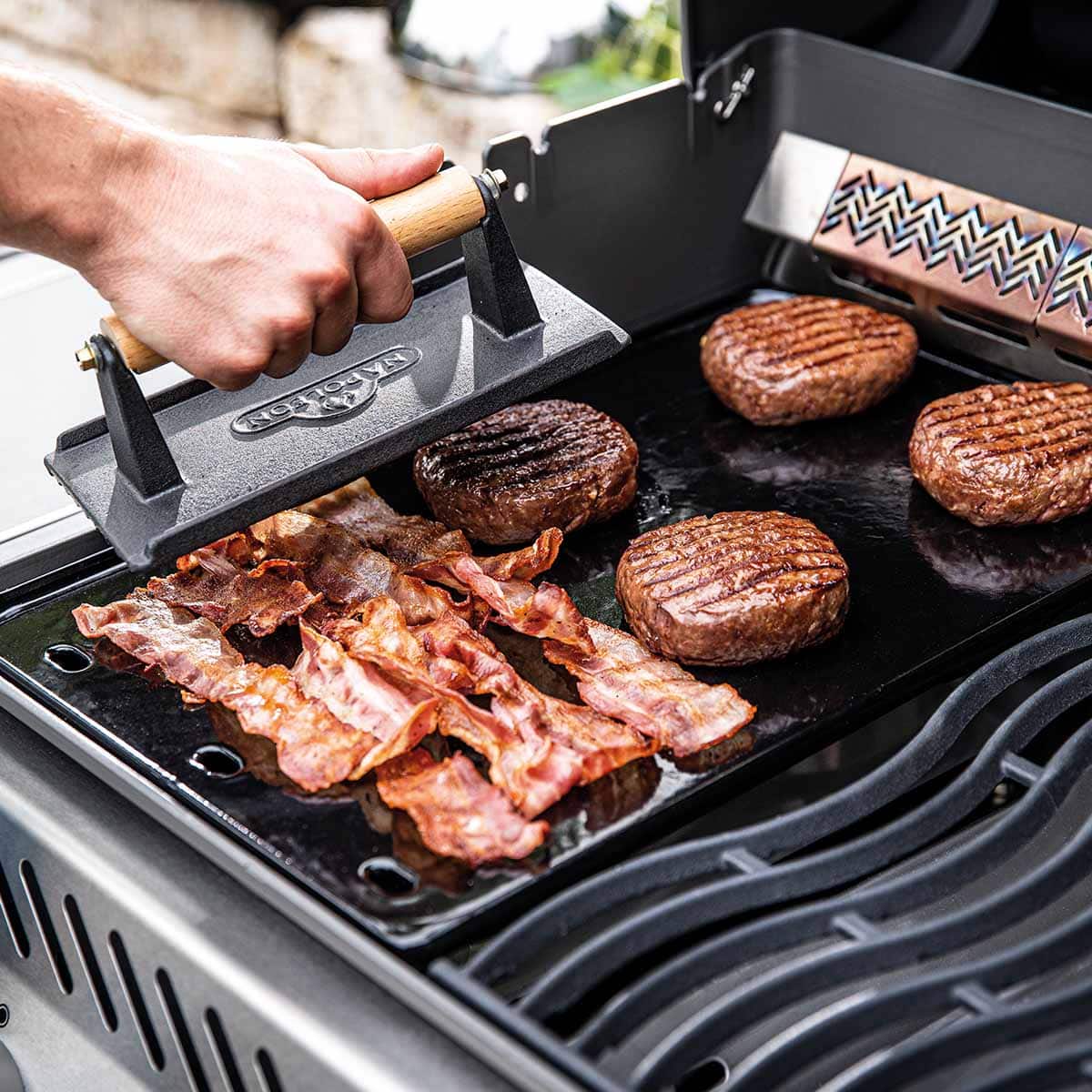Med den här eleganta och praktiska stekplattan från Napoleon vidgar du dina möjligheter vid grillen. Plattan har två olika sidor, en slät och en vågigt räfflad, vilket gör att du kan anpassa användningen efter vad du tillagar. Plattan diskas enkelt i varmt vatten, men ska inte diskas i maskin.