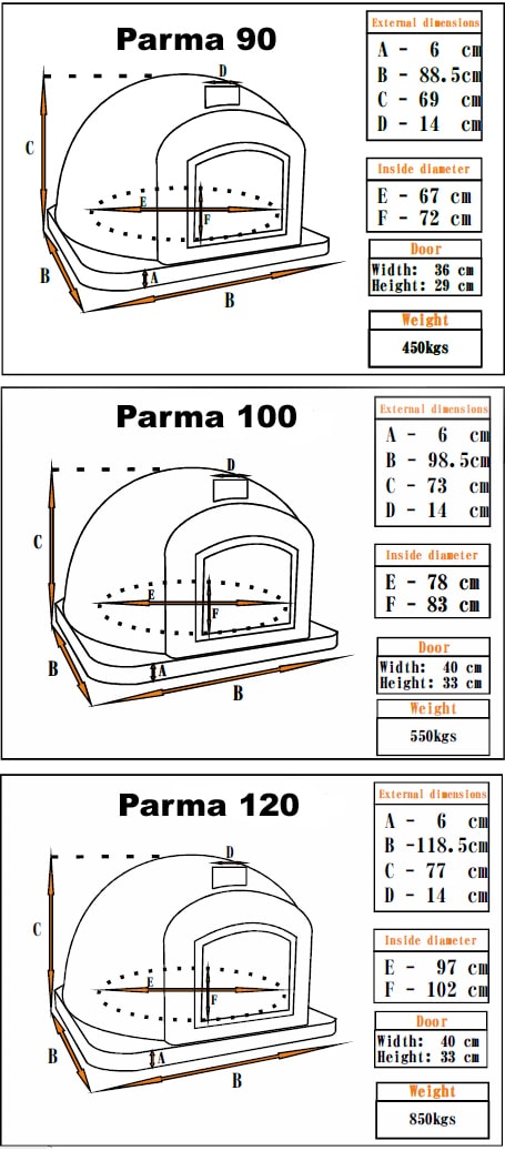 Öppningen till eldstaden är H30, B36 cm och ugnen yttermått är B90 x D90 x H75 cm skorsten ej inräknad. innermått: djup 80 cm, bredd 65 H 37 cm vikt 450 kg.