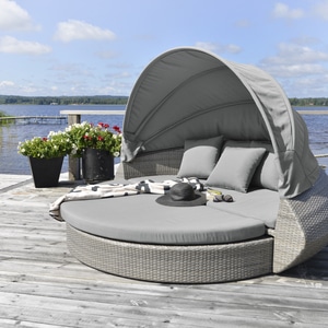 Slappna av och njut i Callao! En inbjudande loungesoffa i konstrotting från Hillerstorp med många funktioner. Ta skydd under det uppfällbara solskyddet varma dagar, och fäll ut soffans underdel om du vill sträcka ut dig eller om du önskar en mer sitt- eller liggplats. Unna dig en stilla stund av lugn och ro!