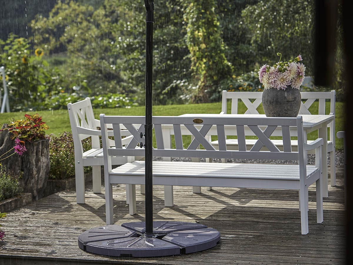 Den rena nordiska formen med klassisk kryssrygg ger ett ombonat och inbjudande intryck, idealiskt för social samvaro och avkoppling utomhus.