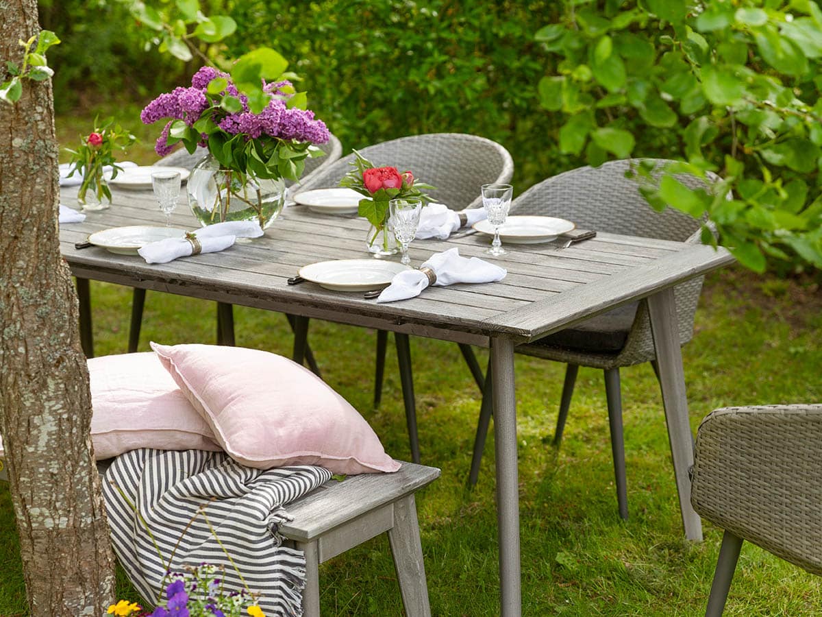 Shabby chic liknande bord i Valletta serien. Grålaserad bordsskiva och benställning i grå FSC®-certifierad furu. Passar utmärkt till Valletta fåtölj. En ny stilren grupp som med sina runda linjer ger ett smakfullt och modernt intryck.
