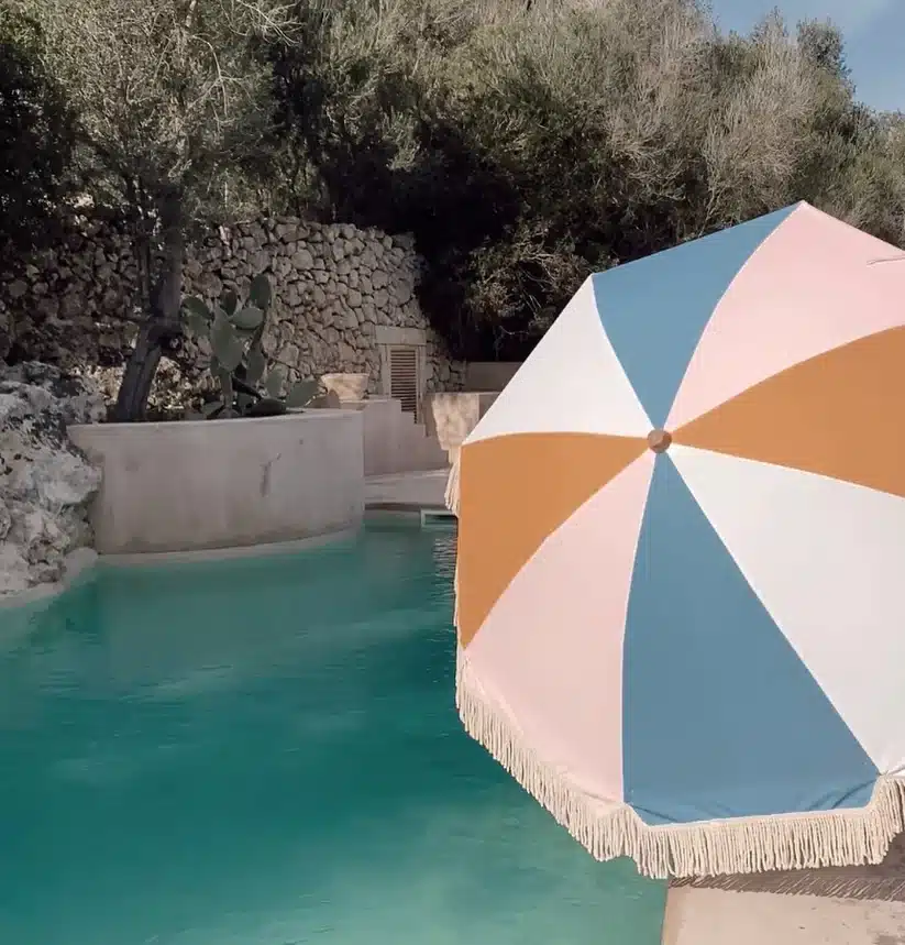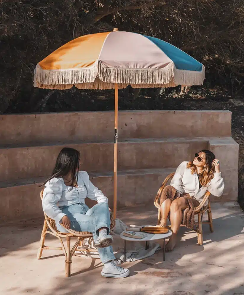 Alvor är blockrandigt i rosa, vitt, blått och orange med naturfärgade bomullsfransar. En riktig stämningshöjare! Med sitt fällbara skaft är det enkelt att fälla ihop och plocka undan.