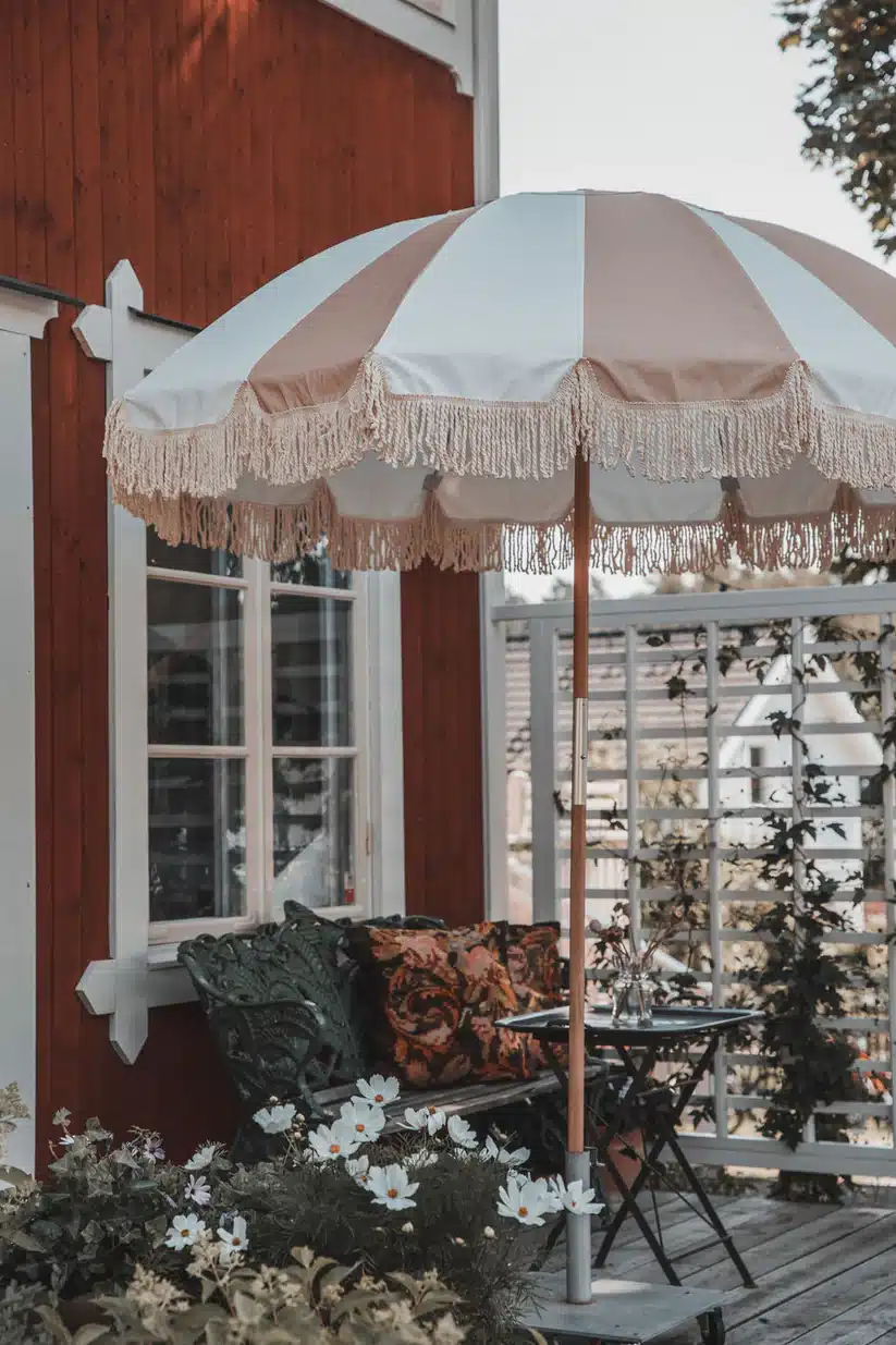 Njut av en varm sommardag eller den första vårsolen under detta charmiga trädgårdsparasoll. Aldrig har ett parasoll varit så iögonfallande! Med sina ränder i vitt och karamell och långa bomullsfransar blir den som ett smycke av härlighet i vilken trädgård som helst.